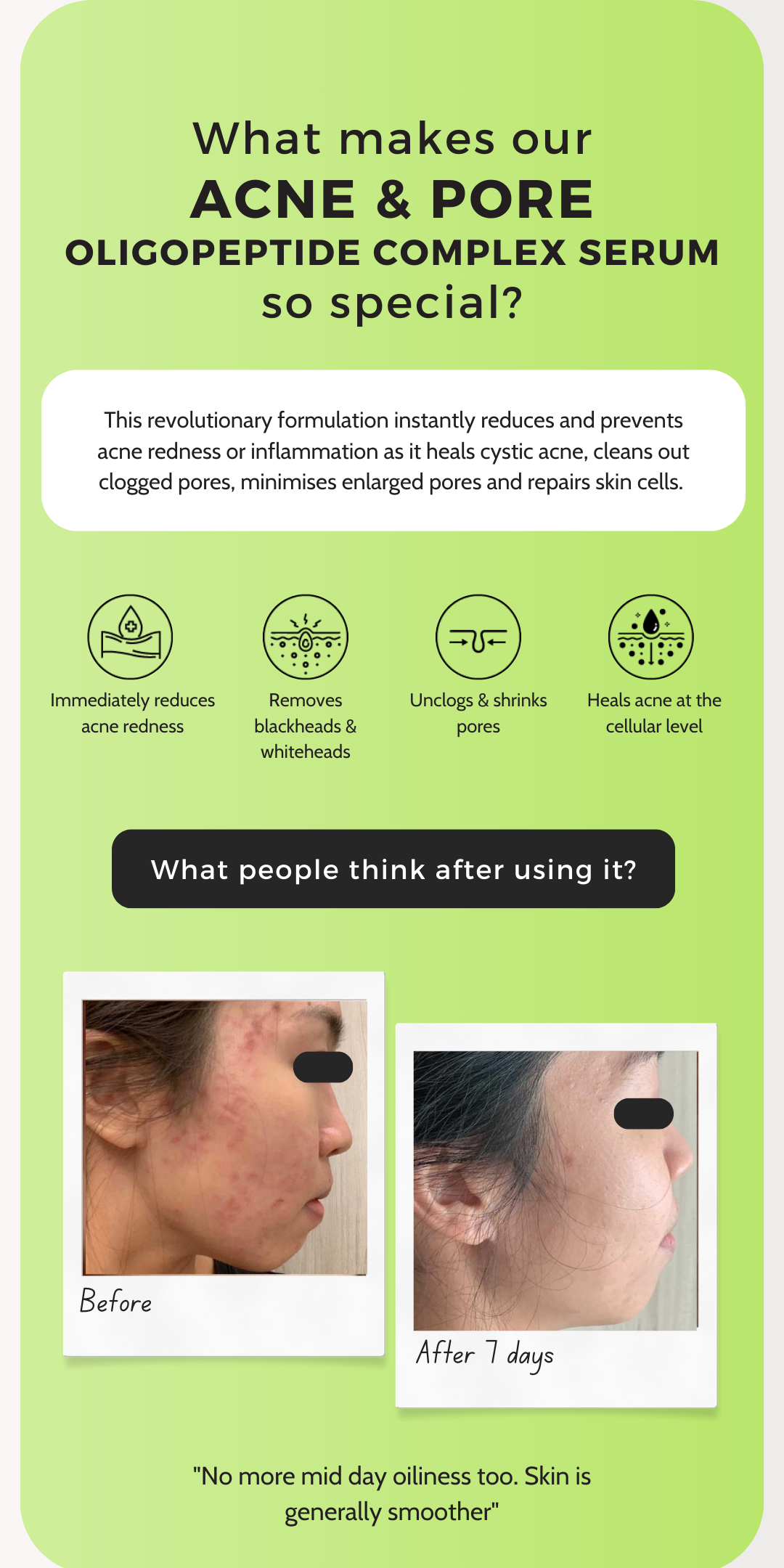 This revolutionary formulation instantly reduces and prevents acne redness or inflammation as it heals cystic acne, cleans out clogged pores, minimises enlarged pores and repairs skin cells. Simultaneously, it regulates collagen production and cell metabolism, hydrates and improves moisture retention as well as lifts away dullness.